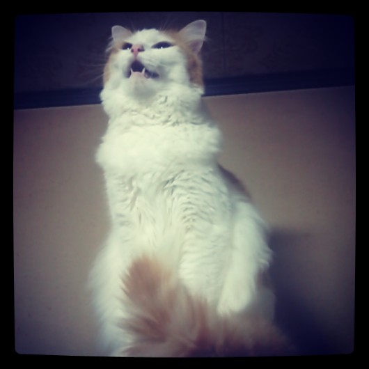 洗面所のドアをジャンプして開けようとしたお猫様です。